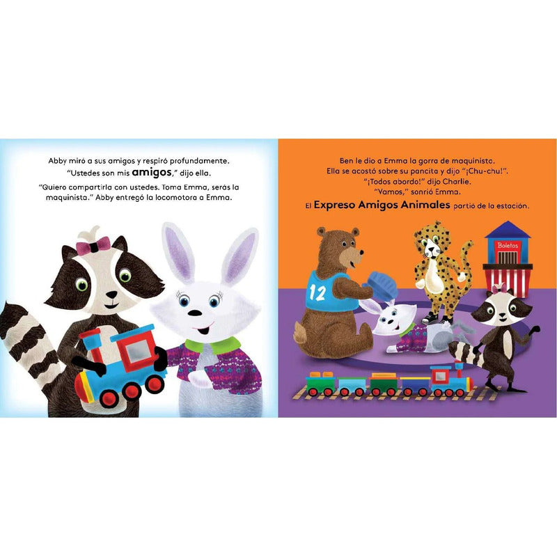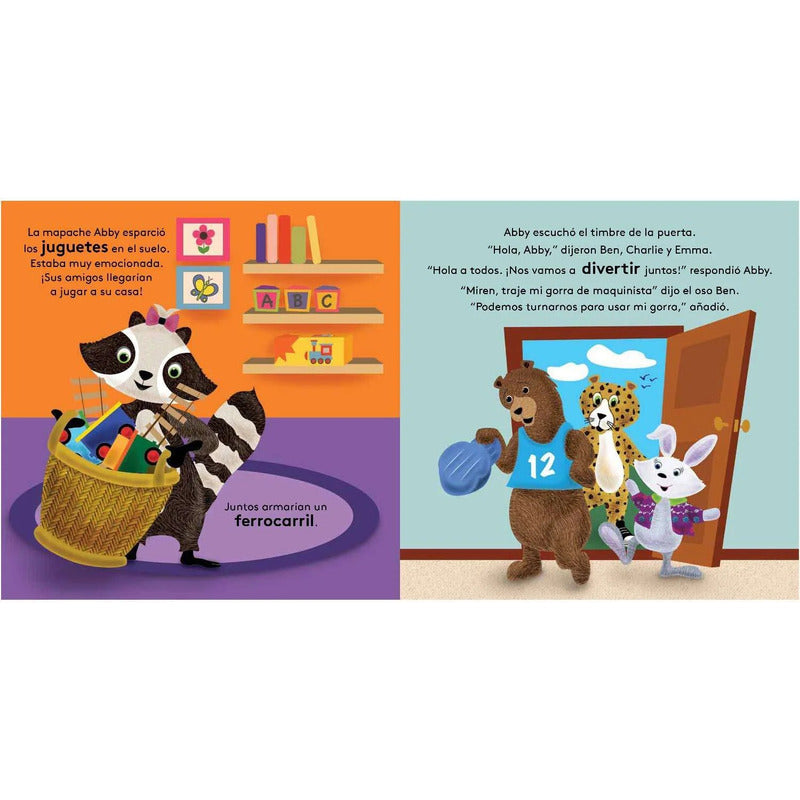 12 Páginas. ¡Es un día de juegos! Los amigos animales construirán un ferrocarril en la casa de la mapache Abby. Pero ¿Qué sucede cuando uno de los amigos no quiere compartir la locomotora? Juntos, los amigos animales aprenden que compartir sus juguetes puede ser muy divertido. Tapa dura e interiores en cartón plastificado resistente Bellas ilustraciones 12 páginas todo color Formato 19.5 x 19.5 cm