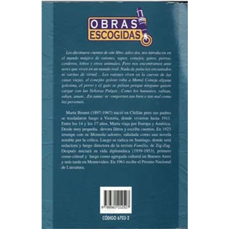 Cuentos Para Marisol / Marta Brunet Reseña: Estos cuentos nos introducen en el mundo mágico de ratones, sapos, conejos, gatos, perros, corderos, lobos y otros animales. Pero nos encontramos ante seres que viven en un mundo real. Nada de palacios encantados ni varitas de virtud... Los ratones viven en las cuevas de las casas viejas, el conejito goloso roba a Mamá Coneja alguna golosina, el perro y el gato se pelean porque ninguno quiere cargar con las Señoras Pulgas... Como los humanos, rabian, odian, aman. En suma, se comportan tan bien o tan mal como las personas. Marta Brunet fue Premio Nacional de Literatura en 1961. Este libro tiene más de 50 ediciones.