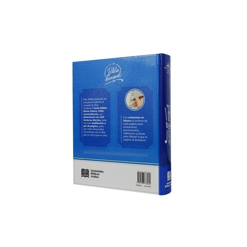 Biblia Devocional 365, reflexiones Diarias para leer, meditar, anotar y vivir. RVR063C DEVO365 Leyendo planes devocionales de bendición para tu vida. Esta Biblia pretende ser una puerta abierta al corazón de Dios. Contiene el texto bíblico Reina Valera 1960 con concordancia y un devocional con 365 lecturas diarias, junto con una meditación a pie de página, para que cada día puedas encontrarte con el Dios que te creó y que te ama. Con columnas en blanco al extremo de cada página para realizar anotaciones, pensamientos reflexiones y dibujos. Escoge esta Biblia porque tiene planes adecuados a ti, con temas actuales y de buena lectura. Ayudas: Como leer la Biblia, – Sugerencias para estudiar la Biblia aplicando el método de estudio Integrativo y Biográfico. Versión Reina Valera 1960 Biblia con letra legible 10 puntos Devocionales para cada día del año Espacio para notas personalizadas 16,5 x 22 cm aprox, 1,1 kg Concordancia Referencias