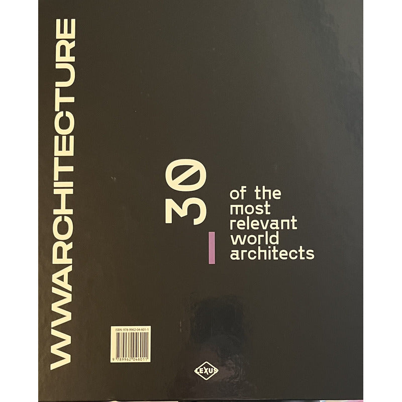 WWarchitecture 30 de los Arquitectos Más Relevantes Mundo / Oscar Asensio (Tapa dura, bilingue Inglés Español) Reseña: 335 Páginas. WWWArchitecture recorre las 30 personalidades más relevantes de la arquitectura a través de sus obras, con una extensa galería de imágenes, no sólo de los edificios y casas realizadas por cada uno, sino también los planos empleados. Además, contiene información sobre las principales características que definen la arquitectura de cada profesional y el año en el que sus obras fueron realizadas. Volumen encuadernado en tapa dura Formato de 23 cm x 26,5 cm 335 páginas Libro en idioma inglés y español Autor: Óscar Asensio