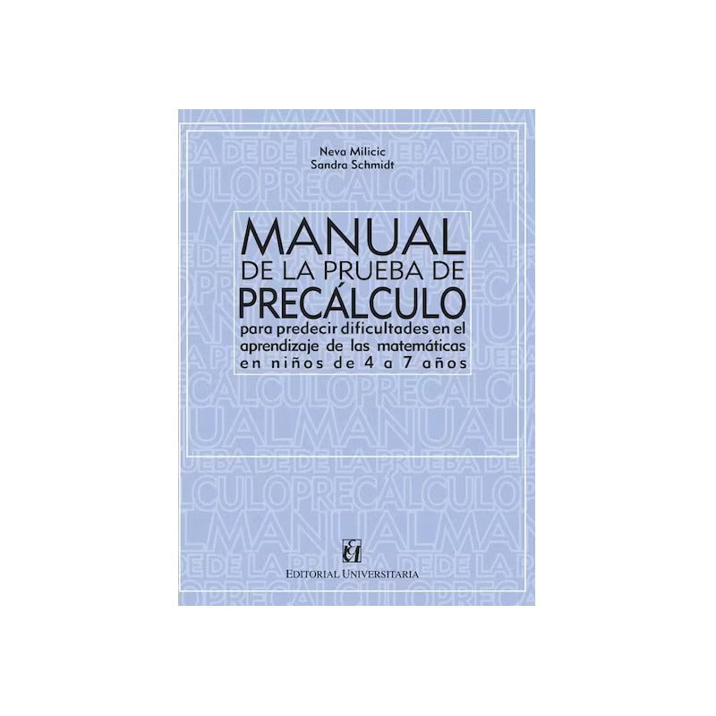 Manual De La Prueba De Precalculo / Neva Milicic Reseña: Este manual de la prueba permite predecir dificultades en el aprendizaje de las matemáticas en niños de 4 a 7 años. Este instrumento, al igual que el de Funciones Básicas, es de uso colectivo y considera diez funciones psicológicas básicas relacionadas con el aprendizaje de las matemáticas: percepción visual, correspondencia, reproducción de secuencias, cardinalidad, reconocimiento de figuras geométricas, entre otras.
