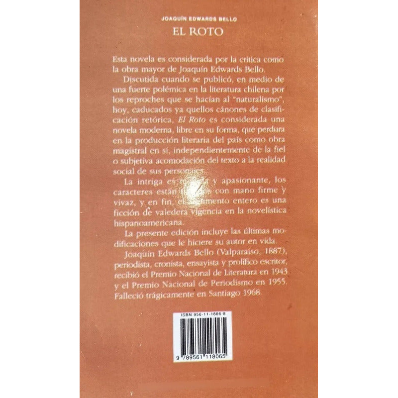 El Roto / Edwards, J Reseña: Última versión, revisada por el autor, de su novela más célebre publicada en 1920. De inspiración naturalista, retrata la vida del prostíbulo chileno y la miseria física y moral del barrio pobre, con implicaciones éticas y sociológicas. Considerada una novela moderna, libre en su forma, perdura en la producción literaria del país como obra magistral en sí, independientemente de la fiel o subjetiva acomodación del texto a la realidad social de sus personajes. Joaquín Edwards Bello recibió el Premio Nacional de Literatura 1943.