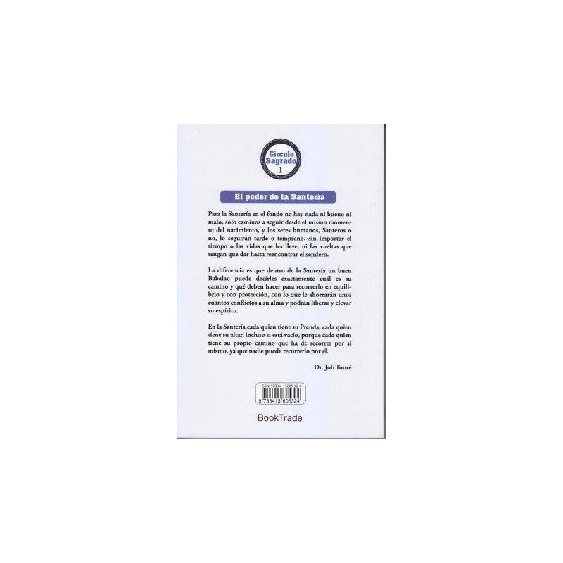 El Poder De La Santeria / Dr. Job Toure Reseña: Para la Santería en el fondo no hay nada ni bueno ni malo, sólo caminos a seguir desde el mismo momento del nacimiento, y los seres humanos, Santeros o no, lo seguirán tarde o temprano, sin importar el tiempo o las vidas que les lleve, ni las vueltas que tengan que dar hasta reencontrar el sendero. La diferencia es que dentro de la Santería un buen Babalao puede decirles exactamente cuál es su camino y qué deben hacer para recorrerlo en equilibrio y con protección, con lo que le ahorrarán unos cuantos conflictos a su alma y podrán liberar y elevar su espíritu. En la Santería cada quien tiene su Prenda, cada quien tiene su altar, incluso si está vacío, porque cada quien tiene su propio camino que ha de recorrer por sí mismo, ya que nadie puede recorrerlo por él.
