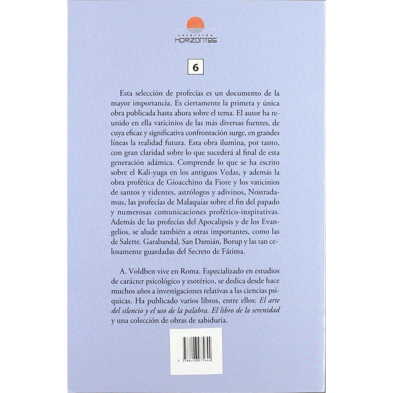 Nostradamus Grandes Profecias Sobre Futuro De La Humanidad Reseña: Esta selección de profecías es un documento de la mayor importancia. El autor ha reunido en ella vaticinios de las mas diversas fuentes, de cuya eficaz y significativa confrontación surge, en grandes lineas la realidad futura. Esta obra ilumina, por tanto, con gran claridad sobre lo que sucederá al final de esta generación adamica. Comprende lo que se ha escrito sobre el Kali-yuga en los antiguos Vedas, y ademas la obra profética de Gioacchino da Fiore y los vaticinios de santos y videntes, astrólogos y adivinos, Nostradamus, las profecías de Malaquias sobre el fin del papado y numerosas comunicaciones profetico-inspirativas. Ademas de las profecías del Apocalipsis y de los Evangelios, se alude también a otras importantes, como las de Salette. Garabandal. San Damian, Borup y las tan celosamente guardadas del Secreto de Fatima. A.A. Voldben vive en Roma. Especializado en estudios de carácter psicológico y esotérico, se dedica desde hace muchos años a investigaciones relativas a las ciencias psíquicas. Ha publicado varios libros, entre ellos: El arte del silencio y el uso de la palabra. El libro de la serenidad y una colección de obras de sabiduría.
