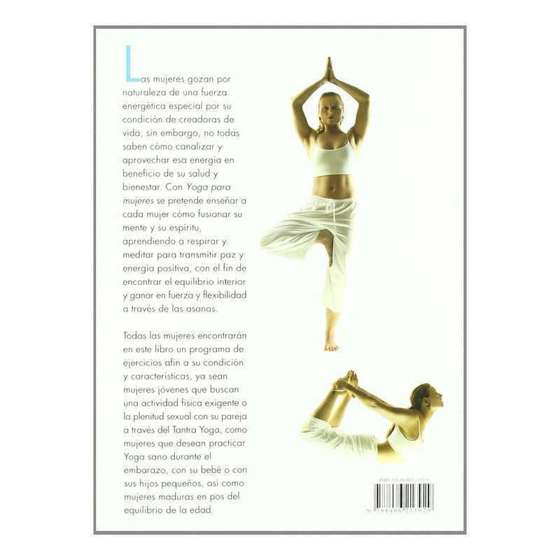 Las mujeres gozan por naturaleza de una fuerza energética especial por su condición de creadoras de vida; sin embargo, no todas saben cómo canalizar y aprovechar esa energía en beneficio de su salud bienestar. Con Yoga para mujeres se pretende enseñar a cada mujer cómo fusionar su mente y su espíritu, aprendiendo a respirar y meditar para transmitir paz y energía positiva, con el fin de encontrar el equilibrio interior y ganar en fuerza y flexibilidad a través de las asanas. T odas las mujeres encontrarán en este libro un programa de ejercicios afín a su condición y características, ya sean mujeres jóvenes que buscan una actividad fisica exigente o la plenitud sexual con su pareja a través del Tantra Yoga, como mujeres que desean practicar Yoga sano durante el embarazo, con su bebé o con Sus hijos pequeños, así como mujeres maduras en pos del equilibrio de la edad.