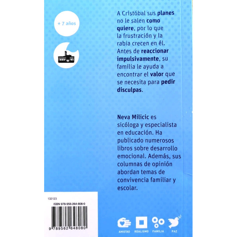 Antes de reaccionar impulsivamente, su familia le ayuda a pensar antes de actuar y a encontrar el valor que se necesita para pedir disculpas cuando la tozudez nos lleva a cometer errores. Los planes de Cristobal no le salen como el quiere, por lo que la frustración y la rabia crecen en él. Antes de reaccionar impulsivamente, su familia le ayuda a pensar antes de actuar y a darle valor a ofrecer disculpas cuando la tozudez nos lleva a cometer errores. Esta obra ofrece a los jóvenes lectores una historia donde lo más importante es aprender a no amargarse cuando las cosas no salen exactamente como uno quiere, a ser lo suficientemente flexible para aceptar las dificultades sin que estas se conviertan en una tragedia y a saber encontrar el lado positivo de las cosas. Edad: