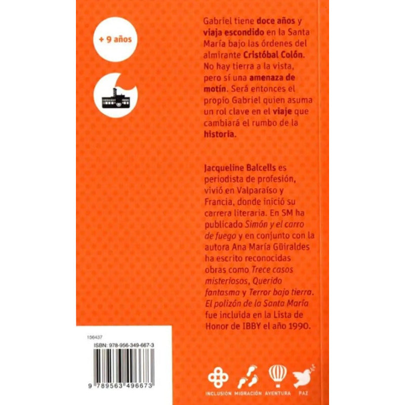 El Polizon De La Santa Maria / Jaquelinne Balcells Reseña: En esta fascinante historia, la autora nos lleva a navegar junto a Cristóbal Colón a bordo de la Santa María en su primer viaje hacia el Nuevo Mundo. En la nave viaja también Gabriel, un niño de doce años que se ha embarcado clandestinamente en la isla Gomera. Cuando luego de diez días de navegación sin avistar tierra la tripulación prepara un motín, Gabriel se dispone a dar su vida para salvar al capitán. El desenlace, imprevisto y alucinante, dará al lector una nueva visión del descubrimiento de América. A partir de 13 años. Nivel 4