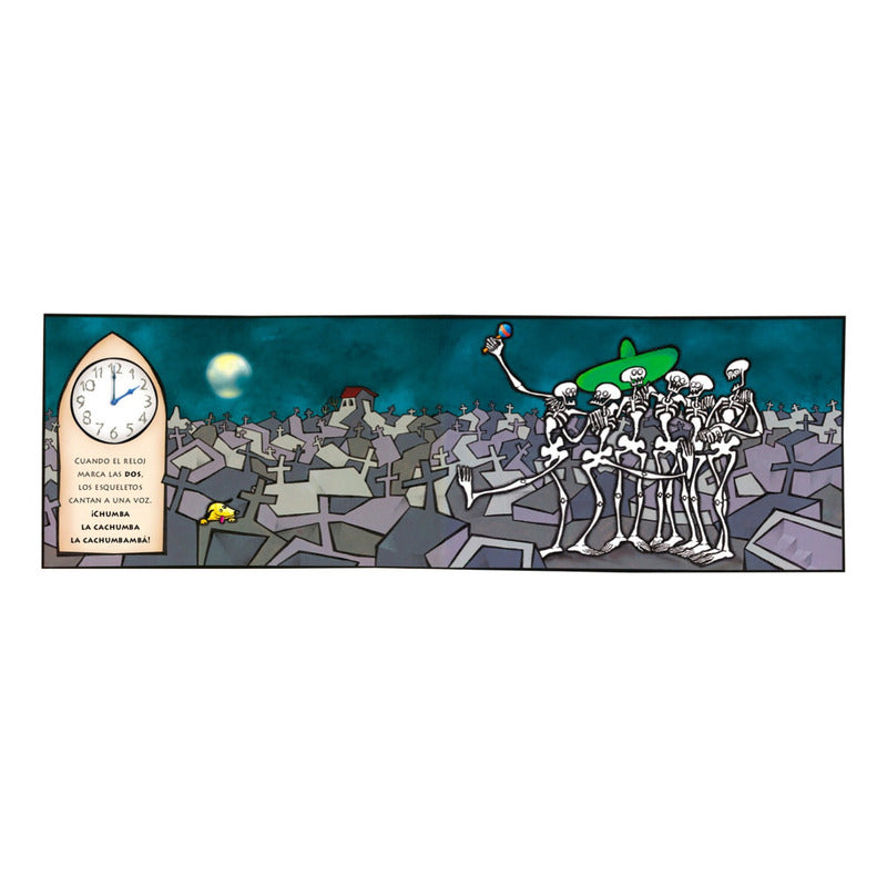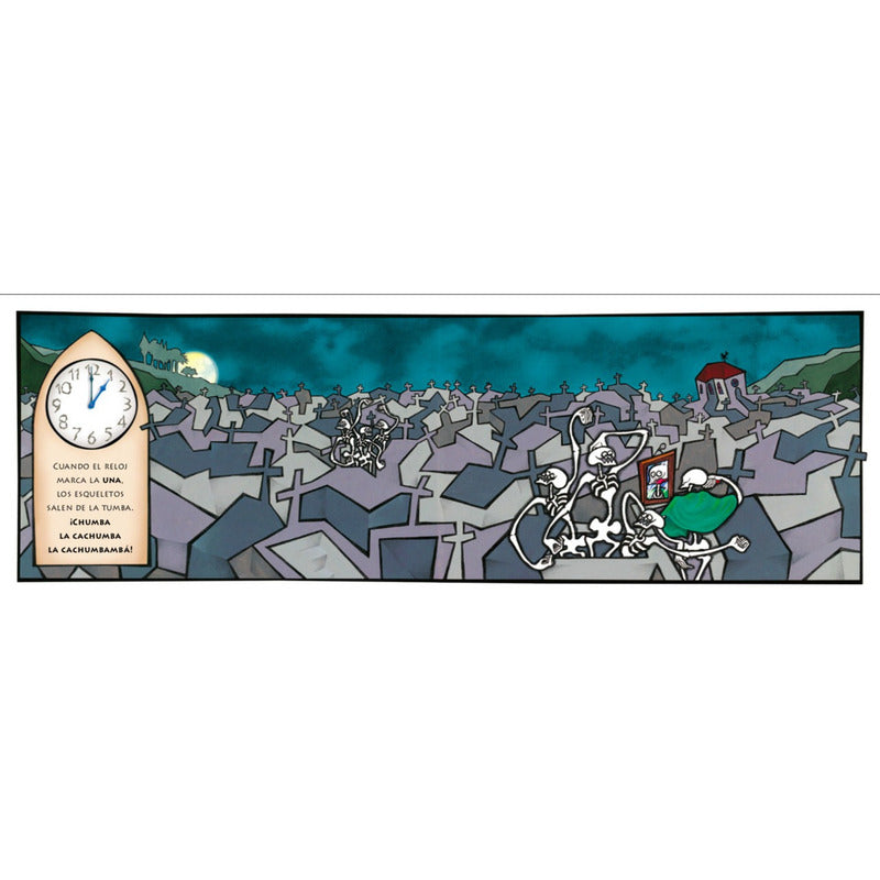 Chumba La Cachumba / Ekare Reseña: 32 Páginas. «Cuando el reloj marca la una, los esqueletos salen de la tumba…». Hora tras hora va creciendo el alboroto en el cementerio hasta que el reloj vuelve a marcar la una y los esqueletos vuelan a la luna. Las ocurrentes ilustraciones de Carlos Cotte hacen de este libro una fiesta visual y una genial manera de aprender a contar y a cantar la hora.