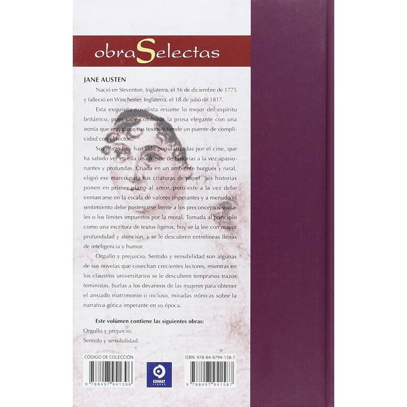 Obras Selectas / Jane Austen Reseña: 624 Páginas. "Los titulos incluidos en esta coleccion excepcional reunen las obras definitivas de algunos de los nombres mas celebres de la literatura mundial. Esmeradas traducciones del ingles, el frances, el aleman, el griego, el italiano y el ruso preservan la esencia de estos clasicos para una audiencia hispanohablante, y los libros mismos estan elegante e impecablemente encuadernados, tal como requieren sus contenidos. Sean obras de drama, ficcion o filosofia, estas obras maestras son ventanas a contextos sociales e historicos muy distintos a los actuales. Este volumen incluye los textos completos e integros de "Orgullo y prejuicio" y "Sentido y sensibilidad," dos de las mas aclamadas y populares novelas de Jane Aust