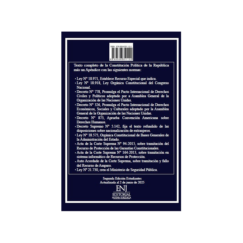 Constitucion Politica De La Republica Ed.oficial Estudiantes AÑO 2025 Texto completo de la Constitución Política de la República y Apéndice seleccionado para los alumnos que incluye las siguientes disposiciones: Ley N°18.971, Establece recurso especial de indica (D.O. de 10 de marzo de 1990). Ley N°18.918, Ley Orgánica Constitucional del Congreso Nacional (D.O. de 5 de febrero de 1990). Decreto N°778, Promulga Pacto Internacional de Derechos Civiles y Políticos (D.O. 29 de abril 1989). Decreto N°326, Promulga Pacto Internacional de Derechos Económicos, Sociales y Culturales (D.O. 27 de mayo de 1989). Decreto N°873, Aprueba Convención Americana sobre Derechos Humanos, denominada “Pacto de San José de Costa Rica” (D.O. de 5 de enero de 1991). Decreto N°5.142, Fija el texto refundido de las disposiciones sobre nacionalización de extranjeros (D.O. 29 de octubre de 1960). Ley N°18.575 (D.F.L. N°1), Orgánica Constitucional de Bases Generales de la Administración del Estado (D.O. de 17 de noviembre de 2001). Acta de la Corte Suprema N°94-2015, sobre tramitación del Recurso de Protección de las Garantías Constitucionales. Acta de la Corte Suprema N°164-2013, sobre tramitación en sistema informático de Recursos de Protección. Auto Acordado de la Corte Suprema, sobre tramitación y fallo del Recurso. Coordinador: Equipo Editorial Nueva Jurídica Editorial Nueva Jurídica ISBN: 9789566351122 Segunda edición, enero 2025 Formato: 18,5 x 26 cm. 160 páginas