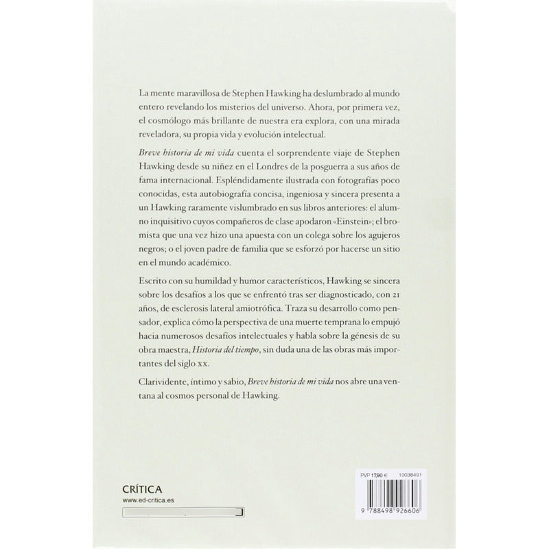 Breve historia de mi vida / Stephen Hawking RESEÑA: 152 Páginas. Tapa rústica.Clarividente, íntimo y sabio, Breve historia de mi vida nos abre una ventana al cosmos personal de Hawking La mente maravillosa de Stephen Hawking ha deslumbrado al mundo entero revelando los misterios del universo. Ahora, por primera vez, el cosmólogo más brillante de nuestra era explora, con una mirada reveladora, su propia vida y evolución intelectual. Breve historia de mi vida cuenta el sorprendente viaje de Stephen Hawking desde su niñez en el Londres de la posguerra a sus años de fama internacional. Espléndidamente ilustrada con fotografías poco conocidas, esta autobiografía concisa, ingeniosa y sincera presenta a un Hawking raramente vislumbrado en sus libros anteriores: el alumno inquisitivo cuyos compañeros de clase apodaron "Einstein"; el bromista que una vez hizo una apuesta con un colega sobre los agujeros negros; o el joven padre de familia que se esforzó por hacerse un sitio en el mundo académico. Escrito con su humildad y humor característicos, Hawking se sincera sobre los desafíos a los que se enfrentó tras ser diagnosticado, con 21 años, de esclerosis lateral amiotrófica. Traza su desarrollo como pensador, explica cómo la perspectiva de una muerte temprana lo empujó hacia numerosos desafíos intelectuales y habla sobre la génesis de su obra maestra, Historia del tiempo, sin duda una de las obras más importantes del siglo xx.