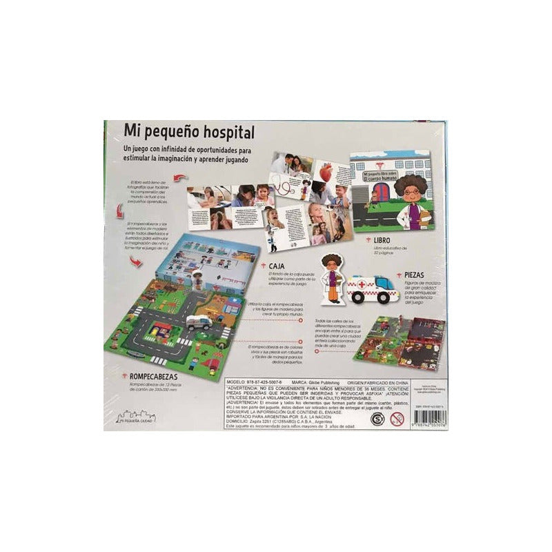 Mi Pequeño Hospital Juega, Aprende Y Diviertete Reseña: Un juego con infinidad de oportunidades para estimular la imaginación y aprender jugando 1.- Libro educativo de 32 páginas 2.- ROMPECABEZAS de 12 piezas de cartón 330x330 mm 3.- CAJA en el fondo puede utilizarse como parte de la experiencia de juego 4.- PIEZAS figuras de madera de gran calidad para enriquecer la experiencia del juego Un juego con infinidad de oportunidades para estimular la imaginación y aprender jugando. El libro está lleno de fotografías que facilitan la comprensión del mundo actual a los pequeños aprendices. El rompecabezas y los elementos de madera esta diseñados e ilustrados para estimular la imaginación del niño y fomentar el juego de rol. El fondo de la caja puede utilizarse como parte de la experiencia de juego. Utiliza la caja, el rompecabezas y las figuras de madera para crear tu mundo. El rompecabezas es de colores vivos y sus piezas son robustas y fáciles de manejar para los dedos pequeños. Todas las calles de los diferentes rompecabezas encajan entre sí para que puedas crear una ciudad entera coleccionando más de una caja.