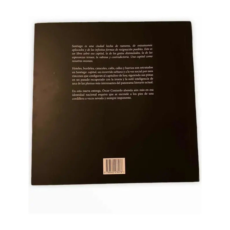 Santiago Capital / Oscar Contardo Reseña: Santiago es una ciudad hecha de rumores, de entusiasmos aplacados y de las infinitas formas de resignación posibles. Este es un libro sobre esa capital, la de los gestos disimulados, la de las esperanzas tenues, la rabiosa y contradictoria. Una capital como nosotros mismos. Hoteles, burdeles, caracoles, cafés, calles y barrios son retratados en ?Santiago Capital?, un recorrido urbano y a la vez social por esos rincones que configuran al capitalino de hoy, siguiendo sus pistas en un pasado recuperado con la ironía y la sutil inteligencia de una de las plumas más interesantes del panorama literario actual.